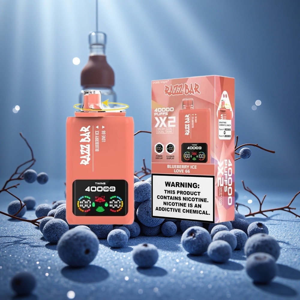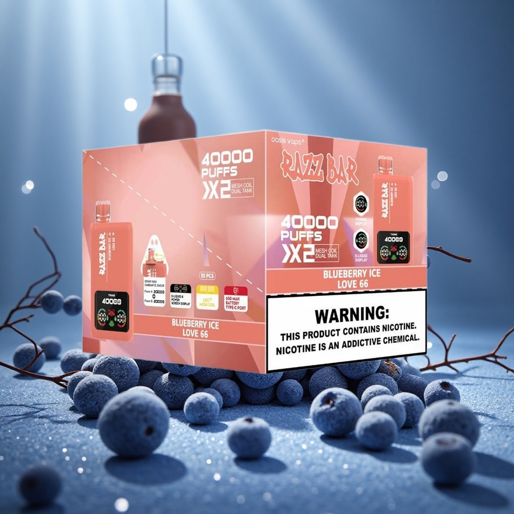 Razz Bar 40000 Puffs Vape Descartável Mirtilo Gelo_Love 66 com Tela de Potência e Bobina Mesh 1.0 Ohm 2